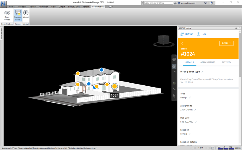 Проектные группы используют проблемы для выявления недоработок и обсуждения вопросов по улучшению модели. Можно создать проблему в Navisworks или BIM 360 и синхронизировать связанные с ней данные между двумя программами, чтобы обеспечить эффективную совместную работу участников проектной группы.