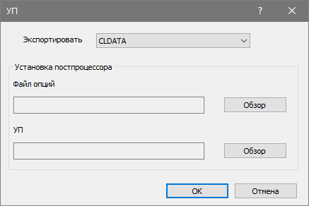 - CLDATA, чтобы генерировать файл управляющей программы. Используйте верхнюю кнопку Обзор, чтобы выбрать файл параметров постпроцессора, который конфигурируется для используемого вами контроллера станка; используйте нижнюю кнопку Обзор, чтобы ввести имя файла управляющей программы.