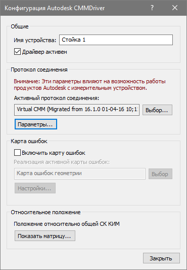 - В диалоге Конфигурация Autodesk CMMDriver нажмите кнопку Закрыть.