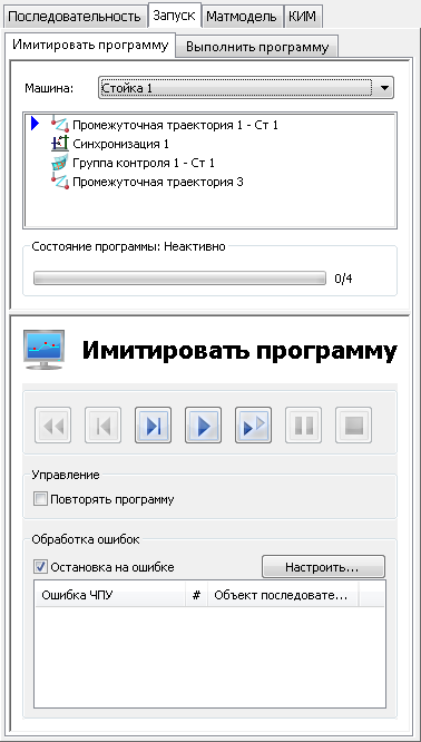 - В списке Машина выберите имитатор для стойки, которую требуется смоделировать. Объекты, назначенные для этой стойки, перечисляются на вкладке Имитировать программу, а стойка и щуп отображаются на виде матмодели.