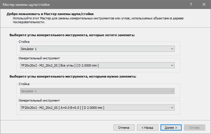 - Выберите Изменить углы щупа и нажмите Далее. В Мастере перечислены углы щупа, которые в настоящий момент используются в последовательности измерения, и доступные замены.