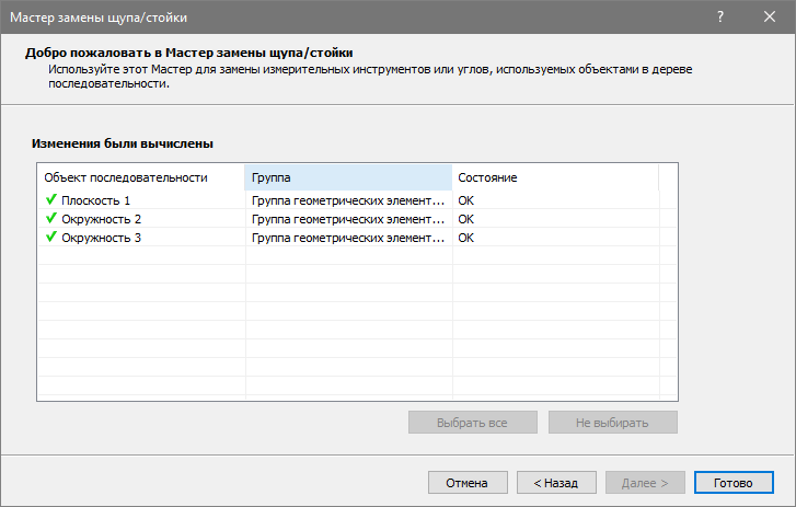 - Выберите вкладку «Траектория» > панель «Сервис» > «Мастер замены щупа». Откроется Мастер замены щупа.
