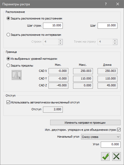 В поле Шаг строк введите расстояние между строками в траектории. В поле Шаг введите расстояние между точками в каждой строке траектории.