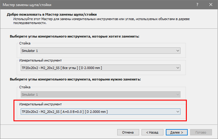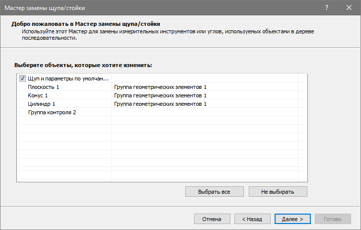Мастер замены щупа позволяет выполнить поиск всех объектов «Щуп и параметры» для измерительного инструмента и заменить их на другие. Это позволяет быстро заменить существующий документ измерения, если требуется выполнить измерение на другом измерительном устройстве или с использованием другого измерительного инструмента.