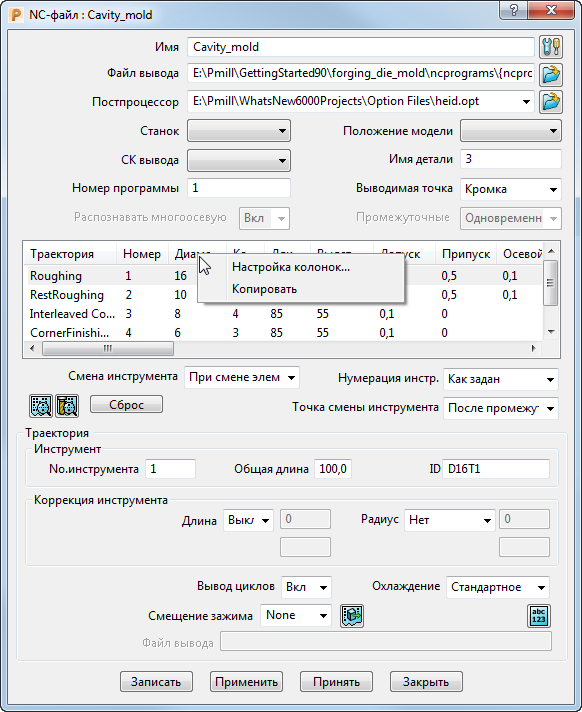 Чтобы настроить виды столбцов в диалогах NC-файл или База инструмента: