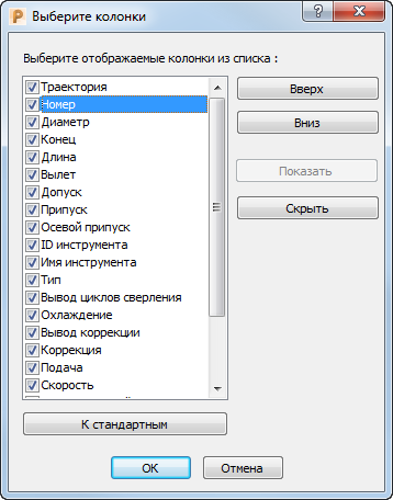 В диалоговом окне Выбор столбцов можно выполнять адаптацию вида столбцов. Таким образом можно управлять объемом данных, отображаемых в диалоговых окнах NC-файл и База инструментов.