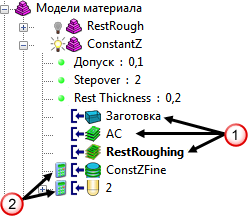 В примере ниже Заготовка, AC и RestRoughing - это вычисленные состояния Модели материала. Таким образом, если используется параметр Применить инструмент после, а модель материала находится в состоянии Заготовка, это делает недействительными оба состояния (AC и RestRoughing) модели материала.