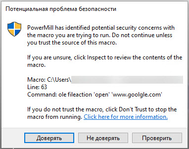 PowerMill проверяет наличие потенциальных проблем с безопасностью при запуске макросов из PowerMill. Если в макросе есть какие-либо проблемы с безопасностью, например потенциально опасные команды, PowerMill предложит проверить эти команды, чтобы убедиться в том, что их можно выполнять.