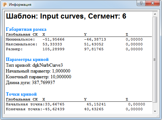 - Свойства — Показывает протяженность, тип и ключевые точки кривой Безье.