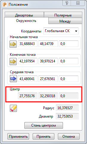 Это откроет диалог Положение, в котором в полях Центральная точка показан центр окружности.