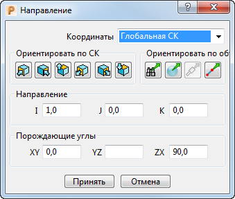 Также можно использовать опции Направление оси Х, Направление оси Y или Направление оси Z на вкладке Редактор ЛСК, чтобы открыть диалог Направление.