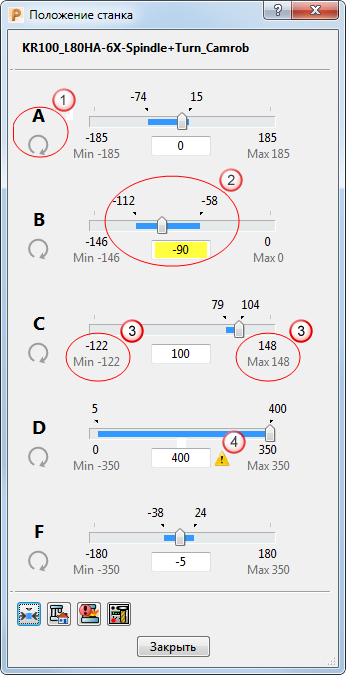 Значение -90 - это текущее положение оси. Синяя линия и значения -112 и -58 показывают самые дальние точки, в которые была перенесена ось в ходе текущей сессии симуляции.