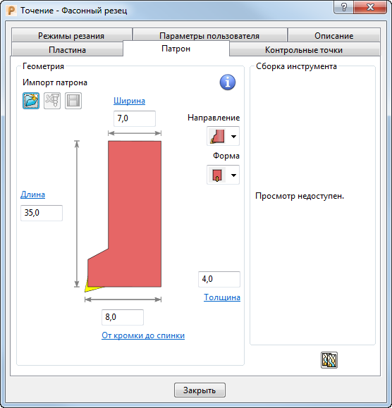 Вкладка Патрон диалога Инструмент задает участок патрона инструмента. Траектории избегают контакта модели с Патроном.