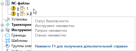 Проект PowerMill может содержать несколько NC-файлов. NC-файлы отображаются в Проводнике в ветви NC-файлы. Наведите курсор на NC-файл, чтобы показать его статус безопасности. Проводник позволяет помещать траектории в NC-файлы, которые потом можно постпроцессировать для создания управляющей программы.