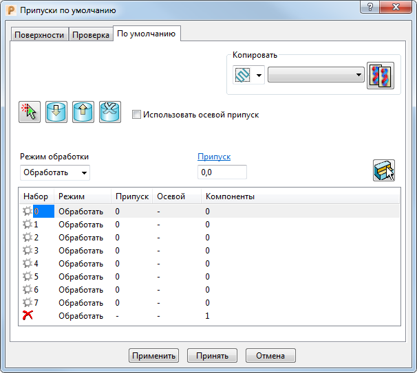 Вкладка По умолчанию позволяет задавать стандартный набор припусков, который не привязан к определенной траектории или границе. Поэтому вы можете использовать её для задания правил припусков по умолчанию для вашей модели.
