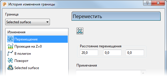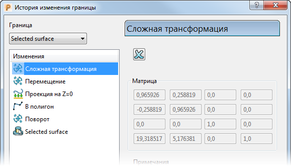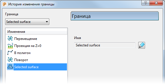 Изменения — эта панель показывает список всех изменений, выполненных с границей. Последнее изменение находится вверху списка, а исходная граница - в конце списка. В правой части диалога показана информация о выбранном изменении.
