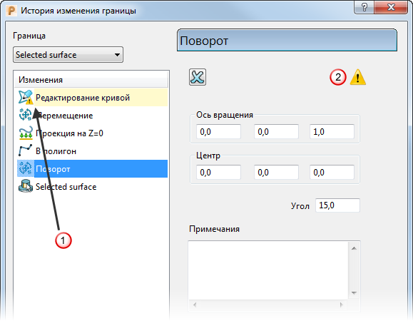 — когда этот значок отображен, журнал границы содержит одну или несколько правок, в которых был выбран сегмент кривой или точка. Если список Изменения содержит одно или несколько таких селективных правок, нажатие на кнопку Вычислить пересчитает границу только до первого изменения, которое требовало выбора, и удалит все последующие изменения.