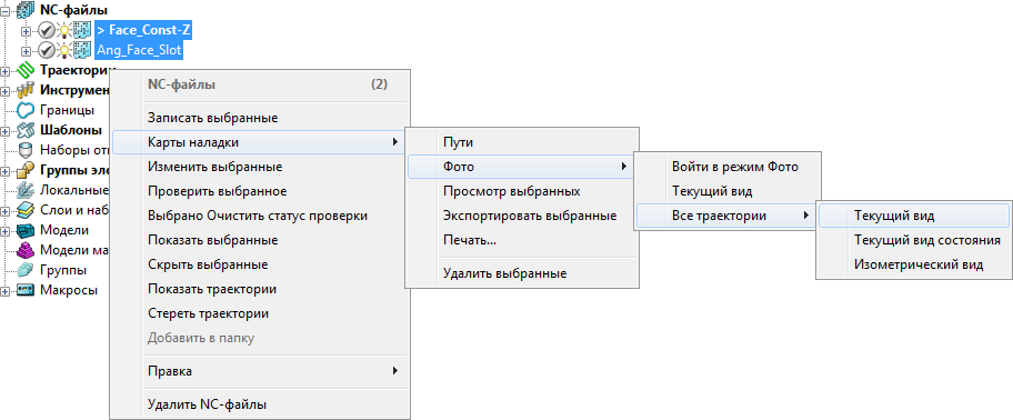 - В Проводнике выберите все необходимые NC-файлы и в контекстном меню выберите «Карты наладки» > «Фото» > «Все траектории» > «Текущий вид».