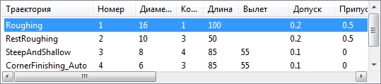 Список траекторий — нажмите, чтобы показать список траекторий и их параметров (используемых в NC-файле) в отдельном диалоговом окне.