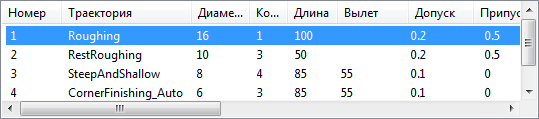 Список траекторий — Показывает все траектории, входящие в состав NC-файла, вместе со всеми параметрами, необходимыми для создания траектории. Выберите одну или несколько траекторий, чтобы отобразить информацию о них в нижней части диалога.