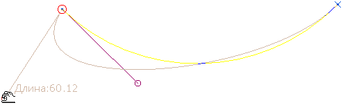 При выборе кривой, а затем точки на кривой отображается точка, касательная и длина касательной.