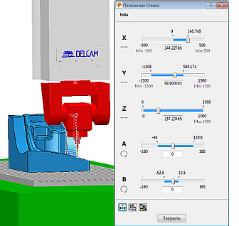 В этом диалоговом окне отображается положение каждой оси станка. Отображение этого диалога полезно, так как позволяет видеть перемещение осей, а особенно, если вы перемещаете ось за пределы её ограничений.