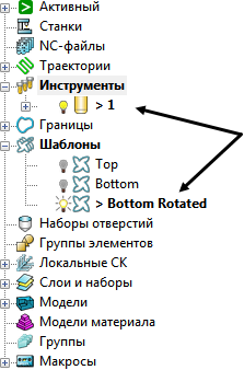 В этом примере ветви Инструменты и Шаблоны развернуты, так как есть активный инструмент (1) и активный шаблон (Bottom Rotated). Ветви Траектории, Границы, Локальные СК, Слои и наборы, а также Модели не развернуты, так как несмотря на то, что в них есть объекты, ни один из них не является активным.