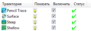 «Таблица траекторий» — отображает все траектории, использующие этот инструмент, и показывает, может ли инструмент обрабатывать деталь без столкновений. Таблица содержит четыре столбца: