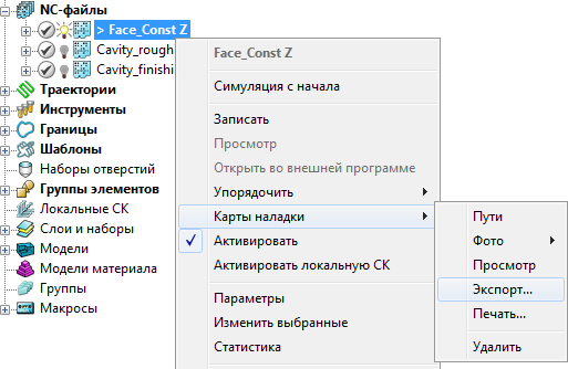 1. В контекстном меню отдельного NC-файла выберите «Карты наладки» > «Экспорт».