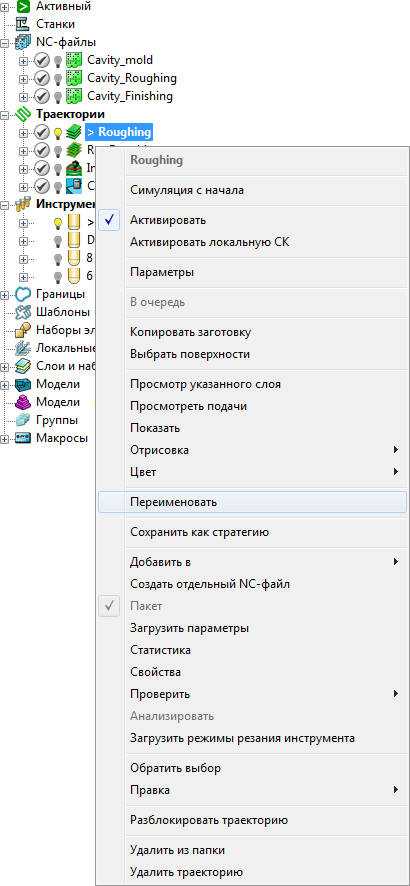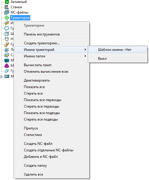 в этом диалоге, чтобы их отредактировать).Пункты контекстных меню для отдельных объектов, находящихся в одной ветви, содержат одинаковые команды. Например, опции меню для отдельных траекторий одинаковые.