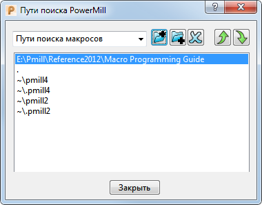 Для добавления нового пути поиска макросов выберите опцию Пути поиска макросов в контекстном меню макроса. Откроется диалоговое окно «Пути поиска PowerMill».