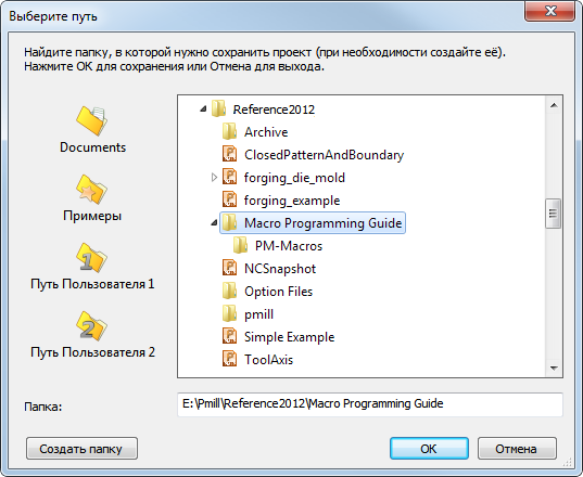 Перейдите в соответствующую директорию (при необходимости используйте кнопку Создать новую папку). Путь отображается в нижней части диалога (в данном случае E:\Pmill\Reference2012\Macro Programming Guide). Нажмите ОК.