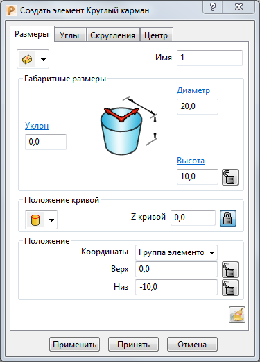 Уклон — Введите угол уклона элемента. Это угол стенки пресс-формы, таким образом, отверстие матрицы шире ее основания, что позволяет с большей легкостью извлекать деталь.