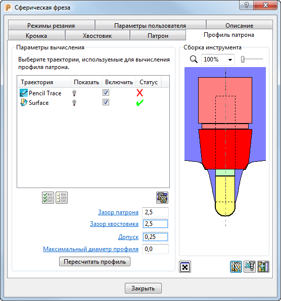 - Нажмите Пересчитать профиль, чтобы вычислить профиль патрона, и посмотреть, будет ли патрон сталкиваться с моделью.