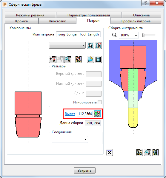 Вкладка Патрон диалога Инструмент задает участок патрона инструмента. Траектории избегают контакта модели с Патроном.