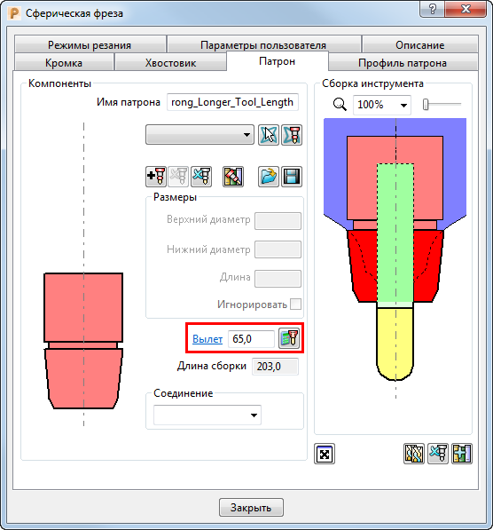 Сборка инструмента — Эта область показывает заданные детали сборки инструмента, а так же профиль патрона.