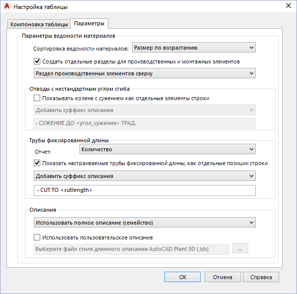 Задание файла стиля полного описания AutoCAD Plant 3D toolset (LDS), который определяет формат всех описаний в ведомости материалов. Можно задать описание размера или описание семейства.