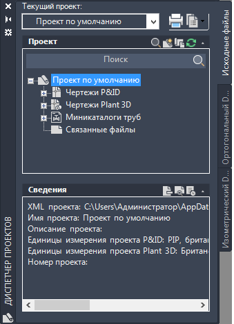 Диспетчер проектов содержит три вкладки: "Исходные файлы", "Ортогональный DWG" и "Изометрический DWG".