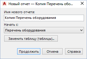 - В диалоговом окне "Новый отчет" введите имя для нового отчета (например, Новый перечень оборудования).