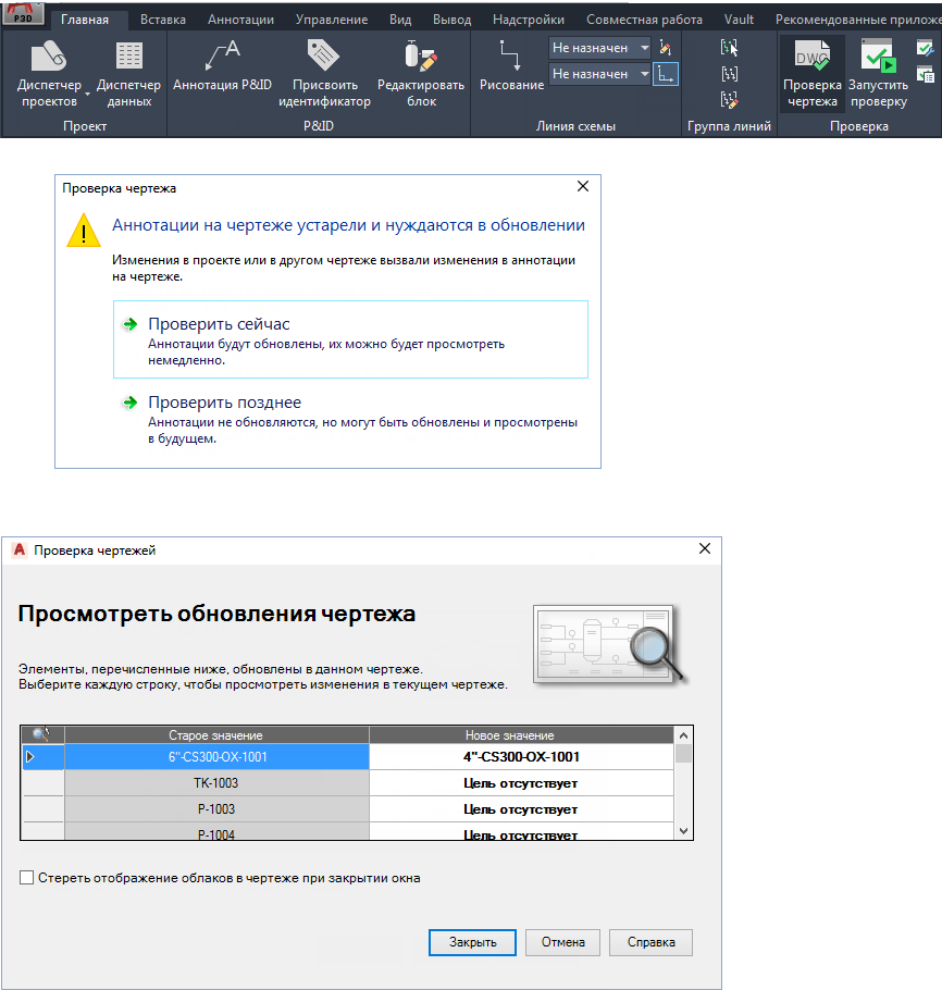 Функция "Проверка чертежей" сравнивает весь текст и все аннотации в P&ID с текущими свойствами проекта и обнаруживает расхождение, возникшие вследствие последних изменений, внесенных в чертеж извне. Также эта функция определяет обновления, необходимые для текущего чертежа.