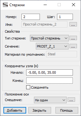 Положение оси позволяет выбрать смещение, то есть отклонение центра поперечного сечения относительно оси стержня. Если после назначения смещения стержню изменить сечение, смещение останется неизменным.