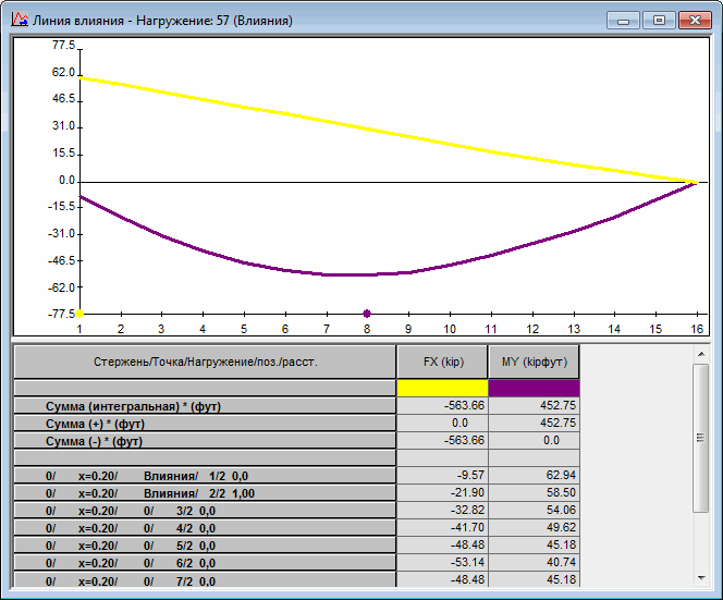 Результаты, полученные для варианта подвижной нагрузки, могут быть представлены двумя способами. Первый способ состоит в представлении результатов расчета вариантов статического нагружения - для положений подвижной нагрузки, выбранных пользователем. Можно перемещать нагрузку шаг за шагом или воспользоваться преимуществами анимации транспортного средства и результатами расчета для варианта подвижного нагружения. Второй способ состоит в представлении изменения выбранной величины в выбранной точке при движении нагрузки по сооружению, то есть в представлении линий влияния выбранных параметров.
