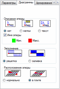 При переходе на вкладку "Диаграммы" в диалоговое окно Разрезы плит позволяет выбирать способ представления эпюры конструкции.