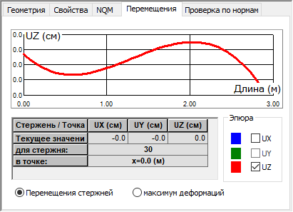 Если выбран параметр «Перемещение стержня», в Robot будут показаны значения общих перемещений UX, UY, UZ в точке с указанными координатами на стержне. Если курсор мыши установлен на таблице в поле в точке, а затем перемещается на эпюру выбранной величины, расположенной в верхней части диалогового окна, то появится вертикальная линия, определяющая значение координаты, для которой в таблице будут представлены необходимые значения перемещений.
