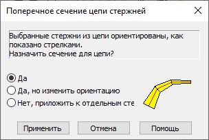 В открывшемся диалоговом окне можно определить способ назначения сечения стержням. В верхней части диалогового окна появляется вопрос, следует ли назначить сечение цепочке стержней. Для применения сечения необходимо выбрать один из трех вариантов ответа.