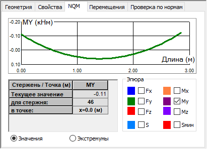 При выборе параметра «Значения» в Robot показываются значения выбранной величины в указанной точке с координатами на стержне.