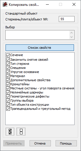 Опция Копировать свойства облегчает определение параметров объектов, стержней и плит. С помощью этого параметра можно копировать все атрибуты объекта (например, для панели: сечения, шарниры, снятия связей и т. д.) в другие объекты.