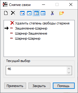 - Поле текущего выбора — отображение узлов или элементов конструкции, выбранных в данный момент. Можно задать снятие связей в выбранных узлах или элементах.