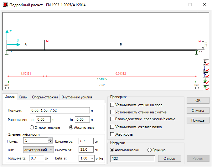 Эта функция позволяет осуществлять подробный анализ катаных или сварных элементов двутавровым поперечным сечением. Доступ к опции осуществляется через нажатие кнопки Подробно в диалоговом окне Подробные результаты для норм EC3.
