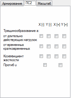 Прим.: Перечисленные количественные характеристики рассчитываются, если выбран расчет трещинообразования и прогибов для данного типа армирования плит или оболочек, используемого в конструкции. Они находятся на вкладке «Параметры ПС2» диалогового окна